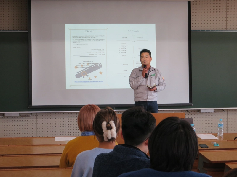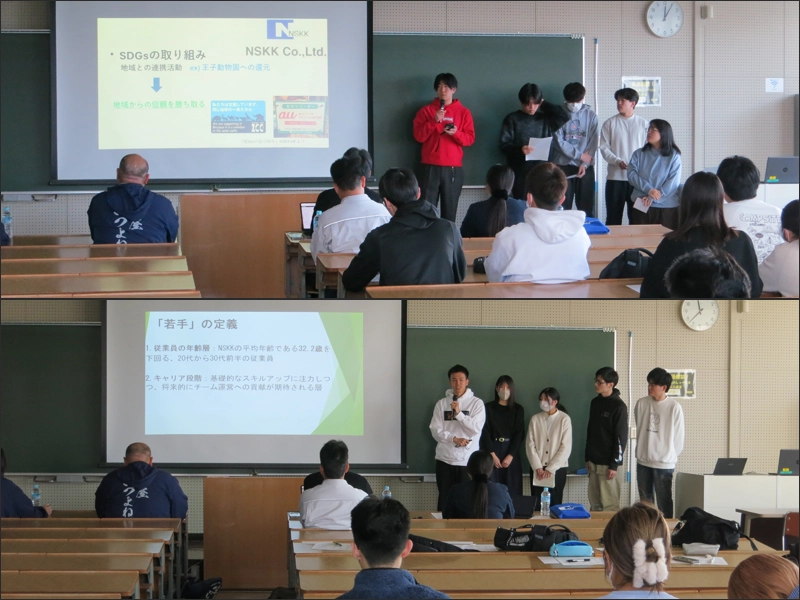 人文学部の新居田久美子講師とゼミ生18人(1年次生)が、1月7日に有瀬キャンパスで兵庫県中小企業家同友会と連携したキャリア教育の最終発表会を実施しました。本発表会では、兵庫県中小企業家同友会の会員企業である株式会社いづよね、株式会社エヌエスケーケーを訪問した学生が4グループに分かれて、各企業から得た学びを発表しました。