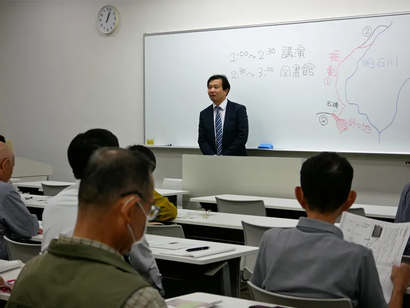 講演のテーマとなった「林崎堀割」は江戸時代につくられた用水路です。明石川西岸を5.3キロメートルにわたって掘削し、明石市明南町の野々池に流れこむ掘割は、長らく農業用水、水道水として利用されてきました。明石市の小学校用副読本『わたしたちの明石』で取りあげられることもあり、明石地域では高い知名度を誇ります。