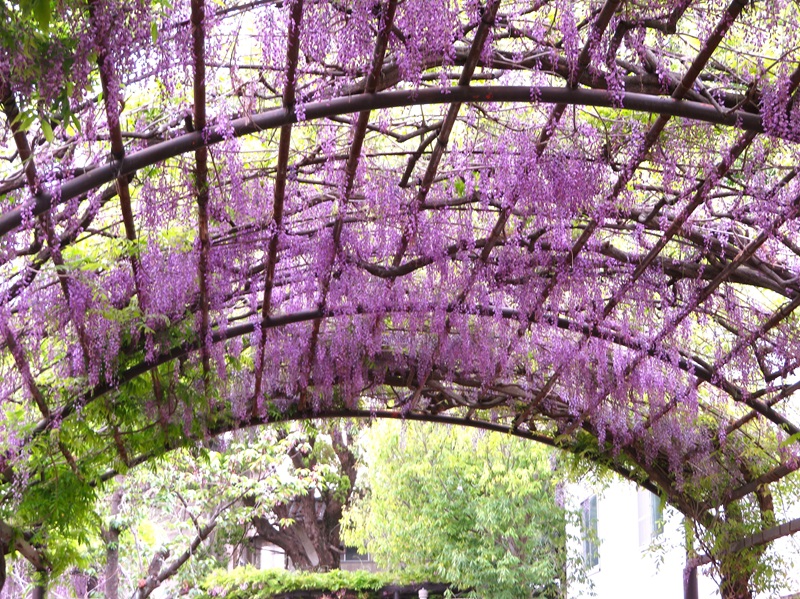 毎年4月中旬ごろから、境内にある藤棚には藤の花が咲き誇ります。一行が訪れた日には、紫、淡紅色、白の花々がまだ七分咲ではありましたが、藤棚を優雅に飾っていました。藤の花は、アニメ「鬼滅の刃」でも取り上げられ、外国人観光客にも知られるところとなっています。