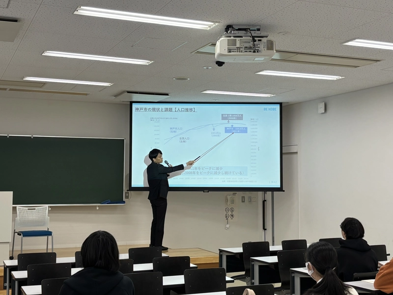 「神戸市役所のしくみを学ぶ~地方自治体の役割・仕組み・仕事の全体像~」と題した初回の講義が、4月14日にポートアイランド第1キャンパスで行われ、神戸市企画調整局大学・教育連携推進課の木村貴洋係長が講師を務めました。