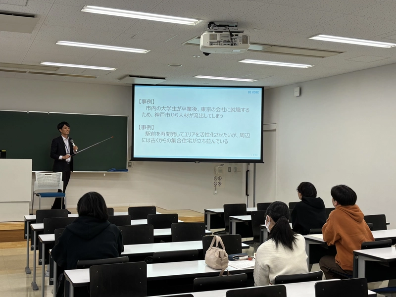前半では、神戸市が有する豊かな自然や歴史・文化・国際性、政令指定都市としての位置づけに関する説明から始まり、人口減少とそれに伴う都市のスポンジ化や空き家の増加などの神戸市が抱える課題について事例を交えながら解説しました。