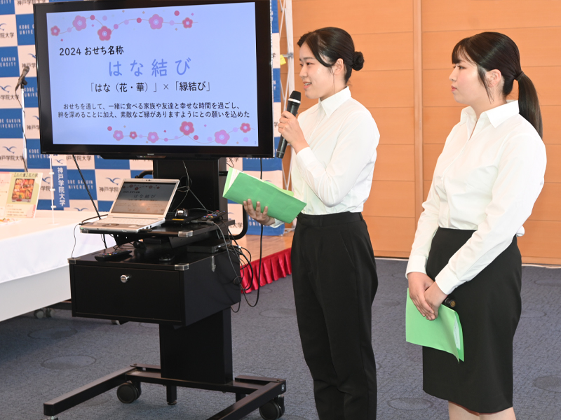 栄養学部3年次生6人が企業とコラボして商品開発したおせち「はな結び」が完成し、9月4日、ポートアイランド第1キャンパスでお披露目会を開催しました。
