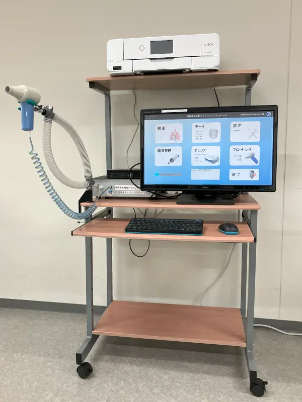精密呼吸機能検査は、一般に特殊ガスを吸入させ、その濃度変化を測定することで肺機能を多角的に評価する検査です。本機器では、安全性の観点から特殊ガスを使用せず、その濃度変化を模擬データとして表示する仕組みを採用しています。