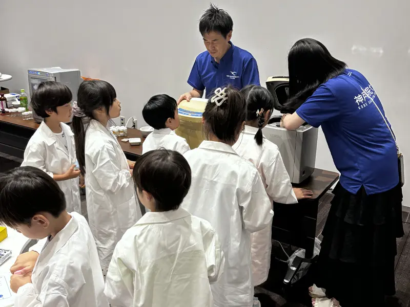 今回のワークショップはナレッジキャピタルで実施する夏休み特別企画として4日間開催するプログラムの第2回目にあたり、小学生とその保護者16組35人が参加しました。福島昭二教授進行のもと、薬学部の福島恵造講師、同学部5年次生の駒居果純さんと秋山あゆみさんがサポートを務めました。