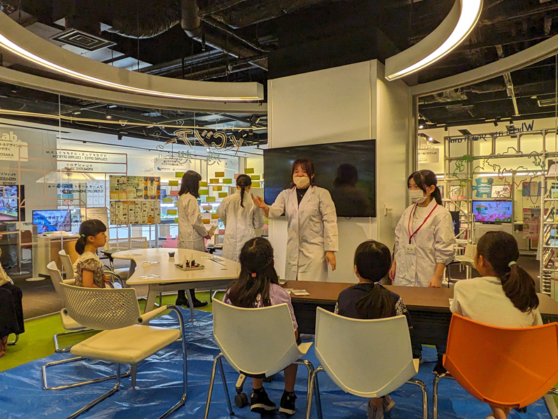 神戸学院大学薬学部の学生と神戸学院大学附属中学校・高等学校の理科部の生徒が8月9日にグランフロント大阪北館ナレッジキャピタルThe Lab.でKOBEこども大学「神戸学院サイエンスLab. 〜おもしろ科学実験!〜」を実施し、のべ200人以上の小学生とその保護者が参加しました。