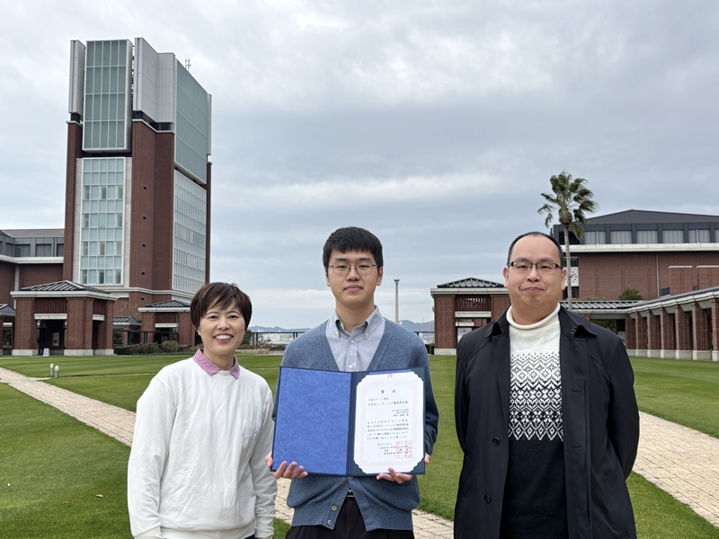 優秀発表賞を受賞し中川教授(左)ら指導教員と記念撮影した原田さん(中央)