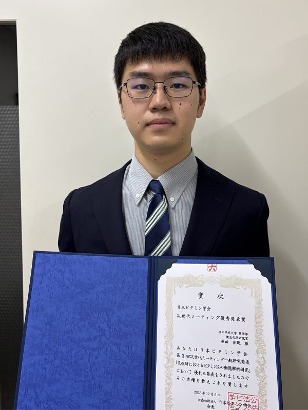 日本ビタミン学会主催の「第3回 次世代のビタミン学に繋げるイノベーションミーティング」が11月21日~28日、オンラインで開催され、薬学部・中川公恵教授の衛生化学研究室に所属する原田佳範さん(5年次生)が優秀発表賞を受賞しました。