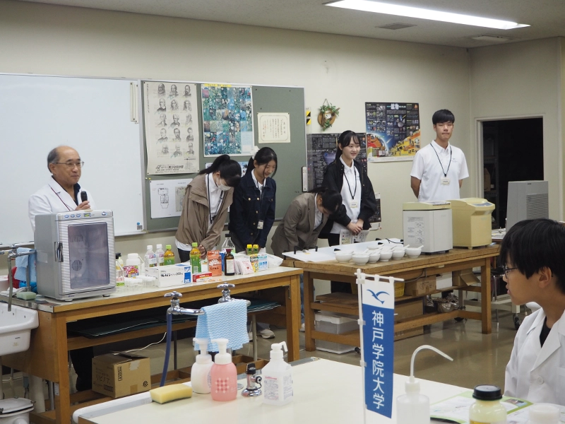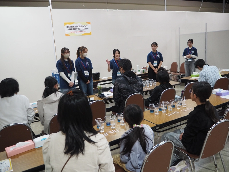 薬学部の科学クラブからは、鶴巻綾香さん、松嶌心春さん、中山一花さん、福田菜穂美さん(いずれも3年次生)、森原真鈴さん、岩本愛菜さん(いずれも2年次生)、鈴木茂文さん、丸林侑暉さん(いずれも1年次生)の8人が参加し、「水溶液がカラフルチェンジ!~神戸学院サイエンス Lab~」を実施しました。