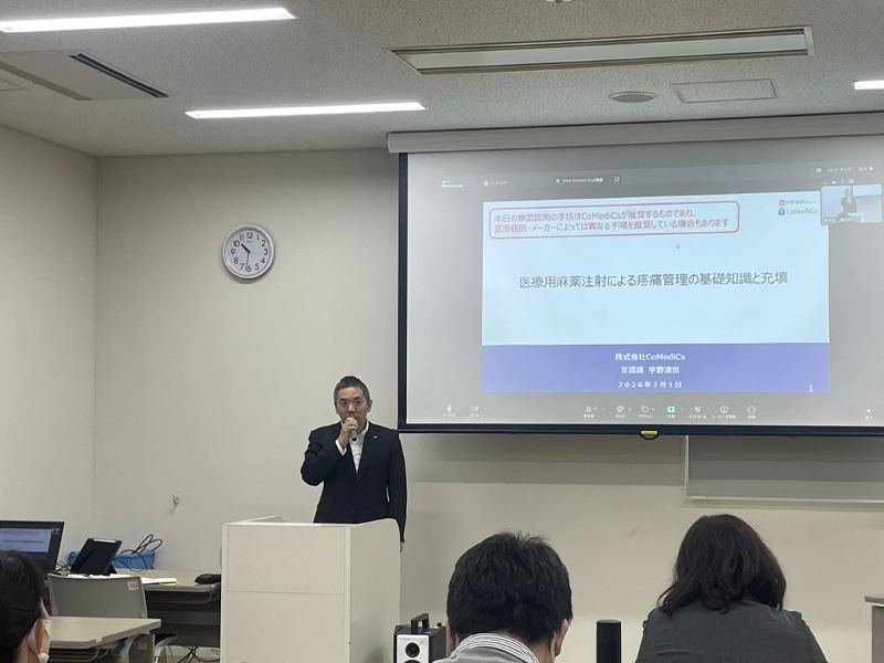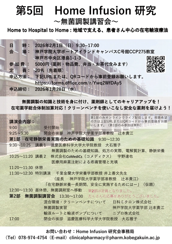 「第5回 Home Infusion 研究 ~無菌調製講習会~」が2月1日、ポートアイランドキャンパスで、オンラインも併用して開催されました。テーマは「Home to Hospital to Home : 地域で支える、患者さん中心の在宅輸液療法」で、在宅医療におけるホームインフュージョン(注1)の普及と、担い手となる調剤薬局薬剤師の支援が開催目的です。第1部は、在宅静脈栄養療(HPN)についての講義、第2部は、実際にクリーンベンチ(注2)を用いて無菌調製の技術指導が実施されました。第1部はオンラインも含めて全国から約70人が参加、第2部は16人の薬剤師が現地参加し、盛況でした。