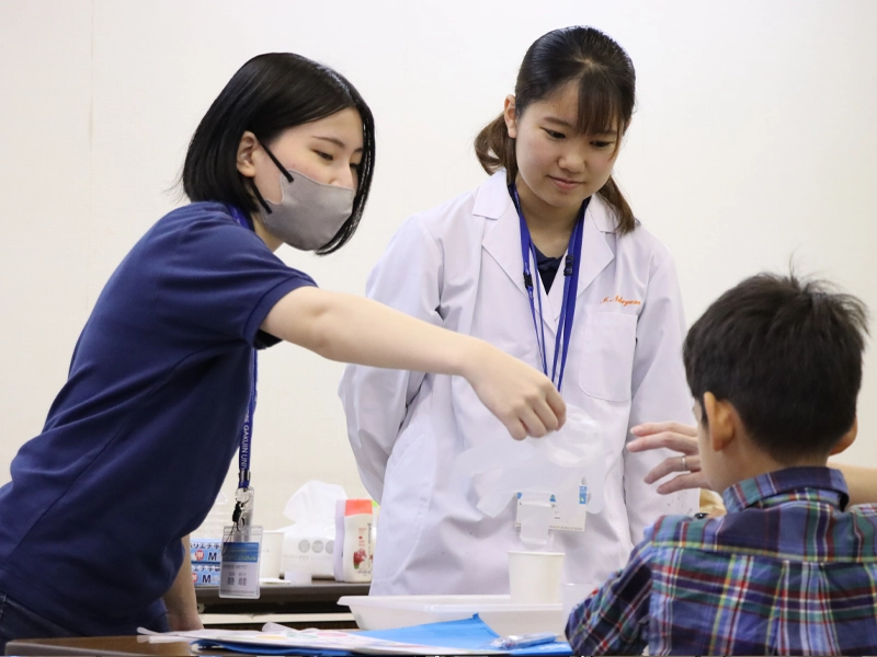 福島教授は、学生スタッフの桂川友葵さん、秋山あゆみさん、駒居果純さん(いずれも薬学部5年次生)と共にワークショップ「くすりの秘密と工夫を学ぼう!~カプセル、錠剤、水薬、粉薬で実験してみよう~」を実演しました。