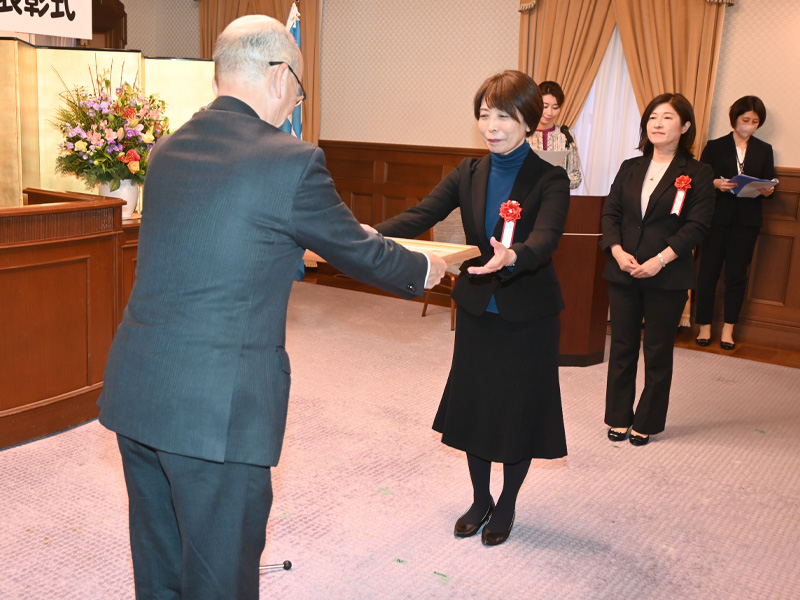 表彰を受けたのは1企業、7団体。少子対策や子育て支援で優れた取り組みのあった団体などが対象です。式典には運営主体の心理学部を代表して村井佳比子教授が出席し、齋藤元彦知事名の表彰状を受け取りました。表彰者全員で記念撮影し、兵庫大学看護学部の森田惠子教授の記念講演がありました。