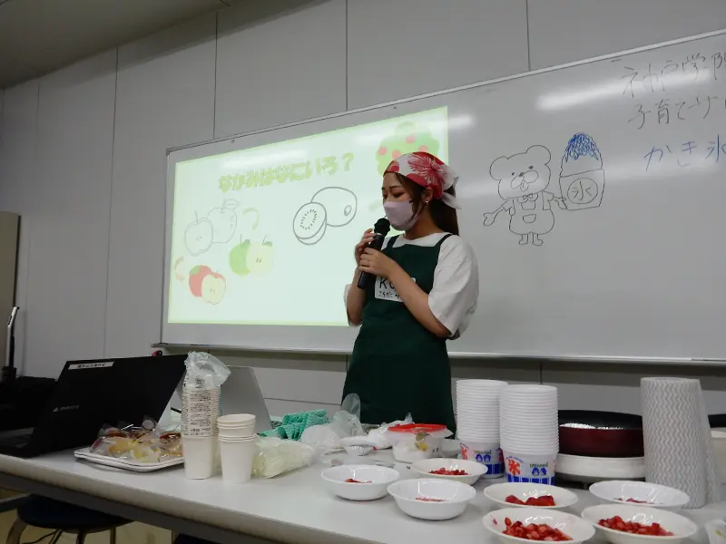 イベントでは、ミニ食育「なかみはなにかな」でフルーツを切って中の色と栄養を学んだ後、手作りのトッピングに使うフルーツを切ってかき氷のソースを作り、フルーツをトッピングしました。