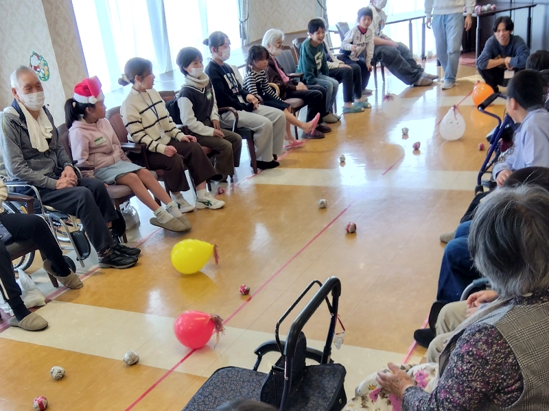 今回のテーマは、「大学生と遊ぶわくわく食堂~風船でこころつなぐクリスマス会~」で、大塚ゼミの3年次生が企画した風船を使ったゲームで入居者と地域の子どもたちが一緒に楽しい時間を過ごしました。