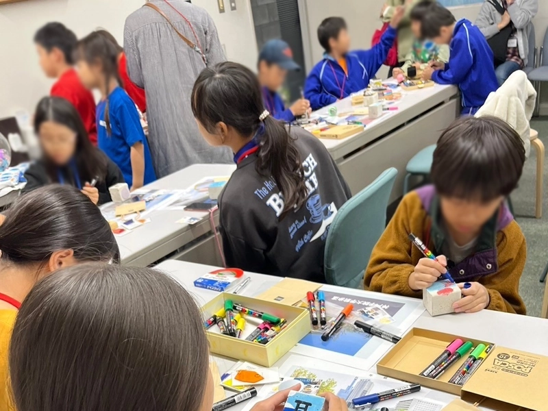 11月8日には「久保田セメント工業株式会社」に協力してもらい「ブロックでアートを作ろう!」を実施しました。家やマンションや道路など身近にあるコンクリートブロックを見て触れて説明を聞き、小さなブロック(チービー)に絵を描いて自分だけの作品を作りました。また、同社のブロックで作ったピザ窯で焼いたピザを食べさせてもらって子どもたちは心もお腹もいっぱいになりました。