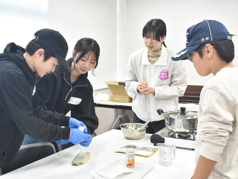 特に力を入れて各地で啓発してきた「ローリングストック法」は食材を「備える→食べる→買い足す」のサイクルで備蓄する方法で、食材を無駄にすることなく、いざというときに食べ慣れたものを食べることができる、と利点を挙げています。備蓄食材をポリ袋を使った「ひと手間調理」で作る防災食として、ホットケーキミックスの粉とカフェオレで作ることのできる「ふわふわカフェオレ蒸しパン」のレシピを紹介しました。