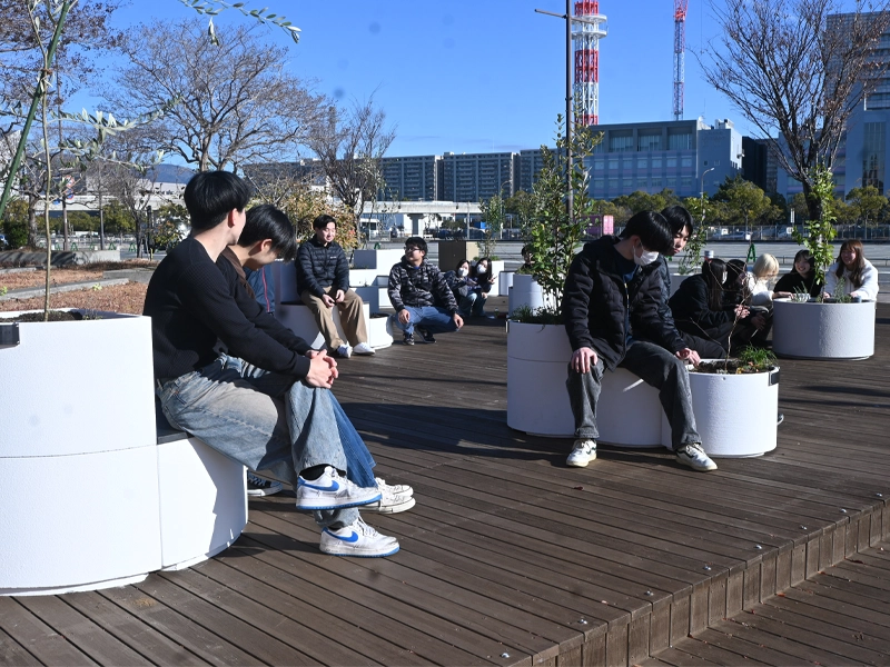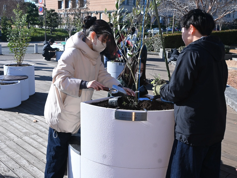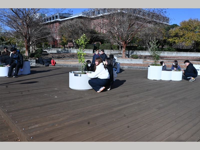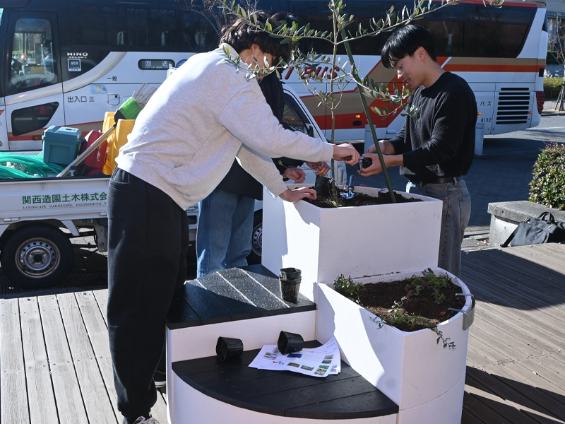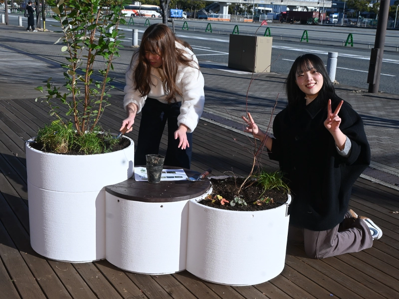 現代社会学部の菊川裕幸講師のゼミ生や教職員有志が設立した任意団体「Botanic Port」のメンバーらが12月19日、ポートアイランド第1キャンパス南東角のウッドデッキでプランターに植栽しました。兵庫県の令和7年度県民まちなみ緑化事業に採用され、近隣の住民の皆さんにも気軽に立ち寄ってもらえる「みどりの交流拠点」をめざします。