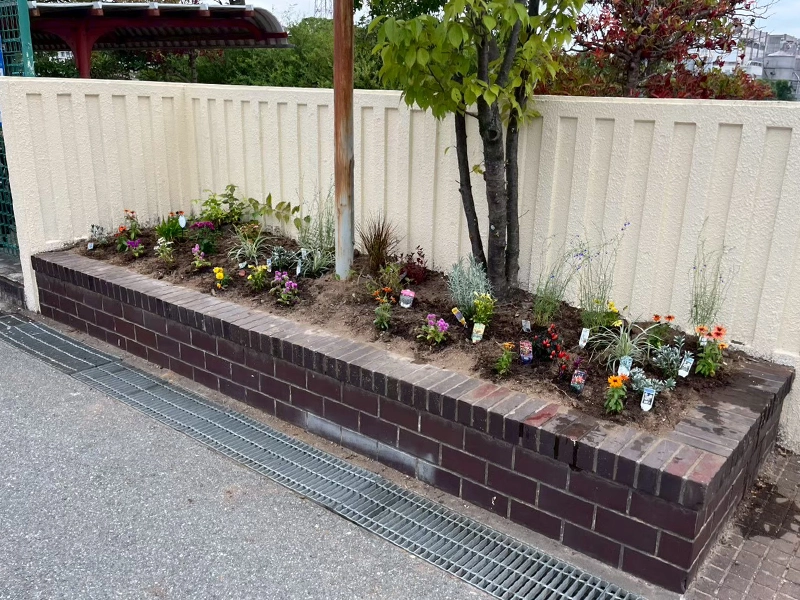 今年度最初の話し合いでは、児童からは、「学校をたくさんの花であふれさせ、学校を明るくしたい」「開花の季節になった花や明るい色の花を植えたい」などの声が上がり、それらの意見をもとに植栽計画を立てました。10月には児童らの意見を反映させた草花で正門前の花壇を彩りました。その後も児童らは水やりや除草作業などを継続して行いました。