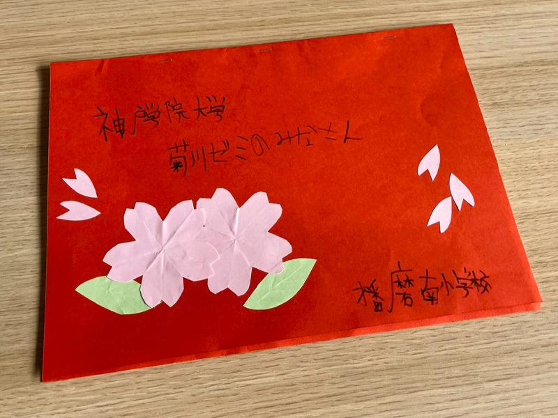 今回の振り返りでは、「学年が違って、普段は関わりのない人とも花壇づくりを通して関わることができて楽しかった」、「水やりの方法に課題はあるが、次年度も継続したい」といった声が上がりました。菊川講師やゼミ生から、一緒に楽しく活動できたこと、一人一人が責任感をもって草花を管理したこと、次年度も一緒に活動することはどれも喜ばしいと伝え、最後にピンク色のスイートピーとメッセージカードを児童にプレゼントしました。児童らからも寄せ書きを頂きました。