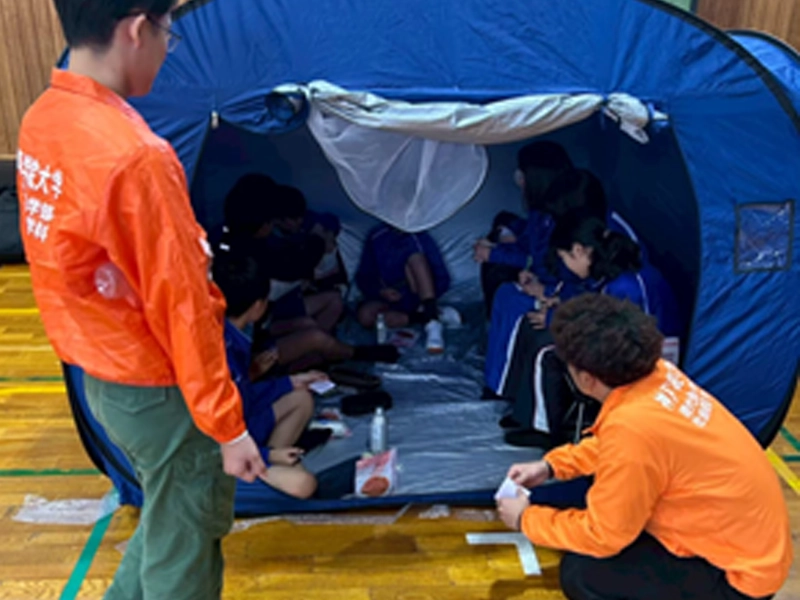 本ワークショップでは、阪神・淡路大震災や東日本大震災の避難所の様子の映像を見て、避難所の課題点などを考えました。そして、災害時に避難所を利用する立場を想定し、簡易トイレの仕組みや使い方について学ぶとともに、段ボールベッドの組み立て、避難所テントの設営と内部のアレンジ、物資の配布などを体験しました。また、グループに分かれて作った自分たちの空間の工夫した点や難しかった点などを発表しました。生徒たちは、実際に手を動かしながら、避難所が「用意された空間」ではなく、利用する人の手によってつくられ、維持される場であることを実感しました。