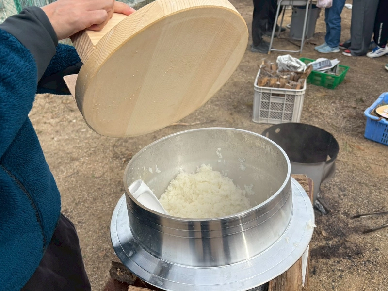 この日は、「わら細工体験」の前に、児童らが同校の敷地内で育てた稲を飯盒炊爨で炊く体験をしました。「普段と食べるご飯よりもおいしい」と児童たちが次々にご飯のお替わりをもらいに行く姿が見られました。