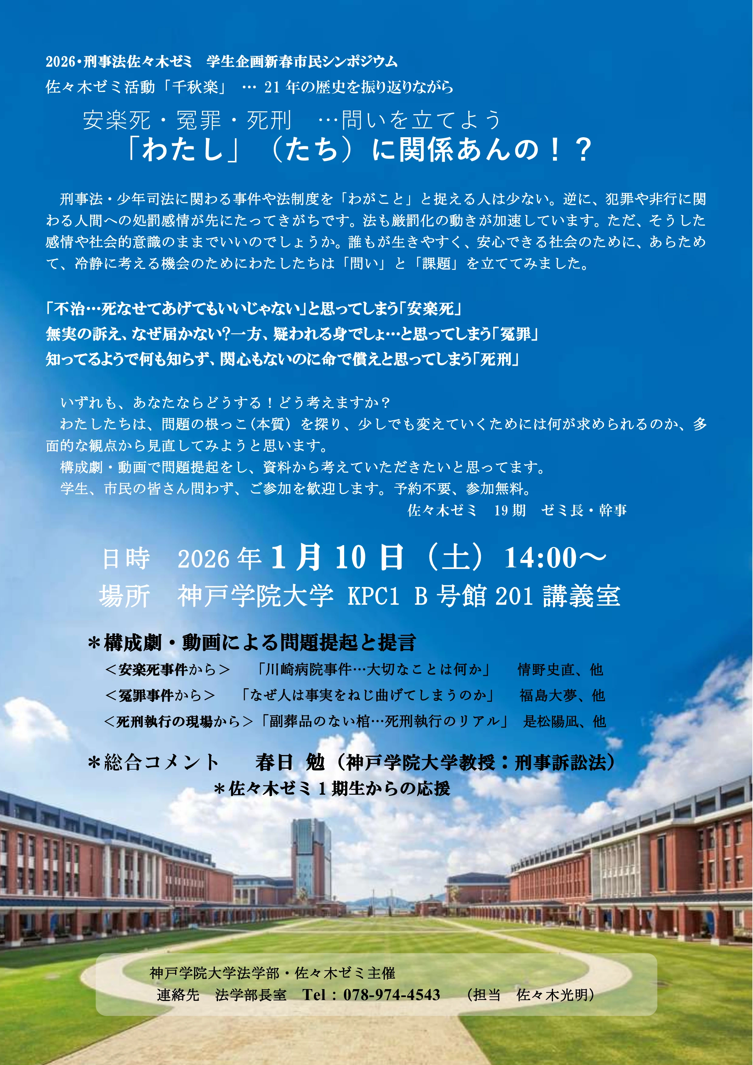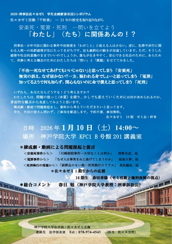 【2026・法学部・刑事法 佐々木ゼミ主催】学生企画新春市民シンポジウム「安楽死・冤罪・死刑…問いを立てよう 「わたし」(たち)に関係あんの!?」