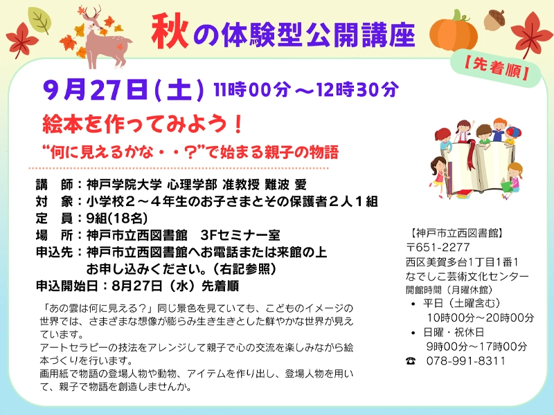 | 会場 | 神戸市立西図書館3Fセミナー室(西区美賀多台1丁目1番1なでしこ芸術文化センター) |