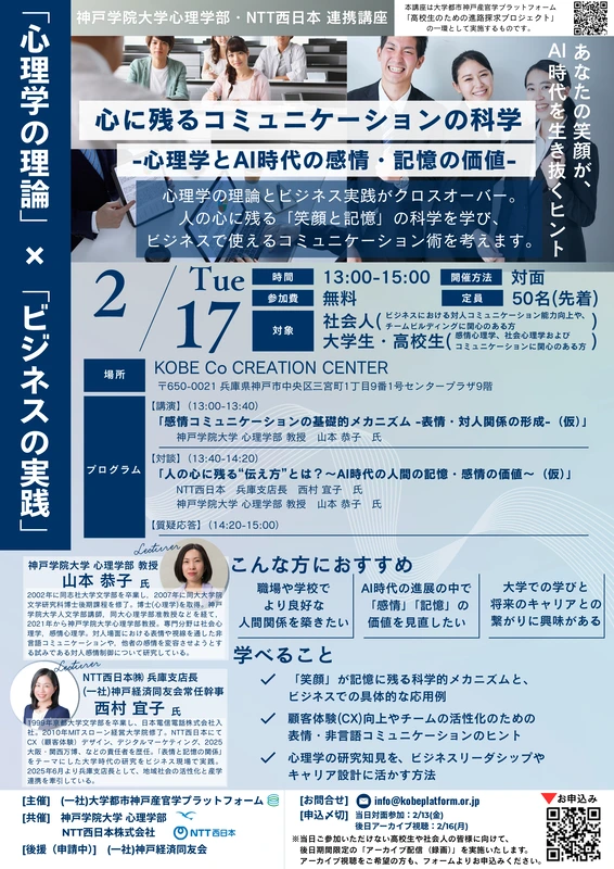 【大学都市神戸産官学プラットフォーム】神戸学院大学心理学部・NTT西日本共催 連携講座「心に残るコミュニケーションの科学 -心理学とAI時代の感情・記憶の価値-」