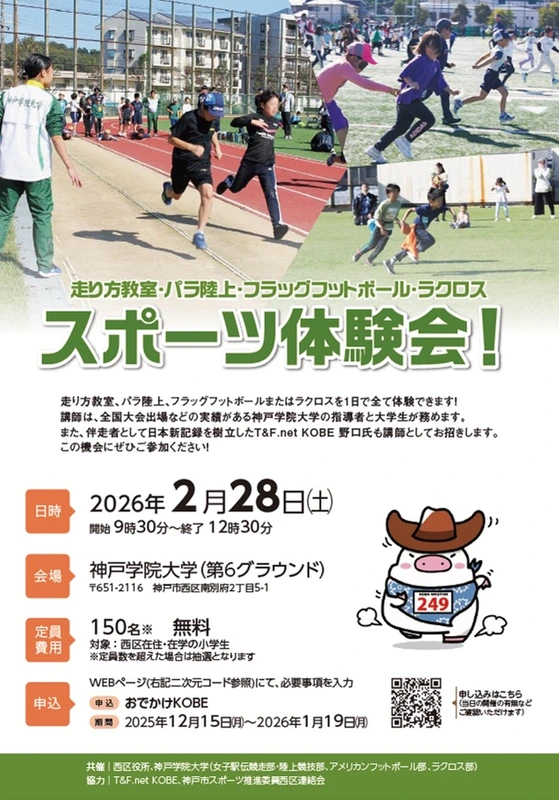 地域連携の取り組みの一環として、神戸市西区在住・在学の小学生を対象としたスポーツ体験会を開催します。