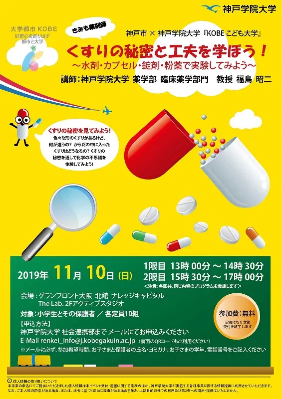 【KOBEこども大学】きみも薬剤師「くすりの秘密と工夫を学ぼう!」 ~水剤・カプセル・錠剤・粉薬で実験してみよう~