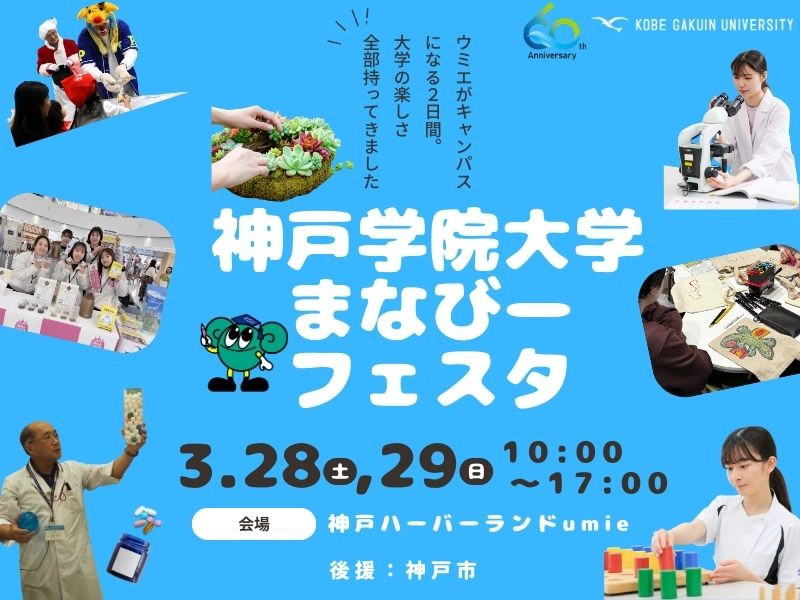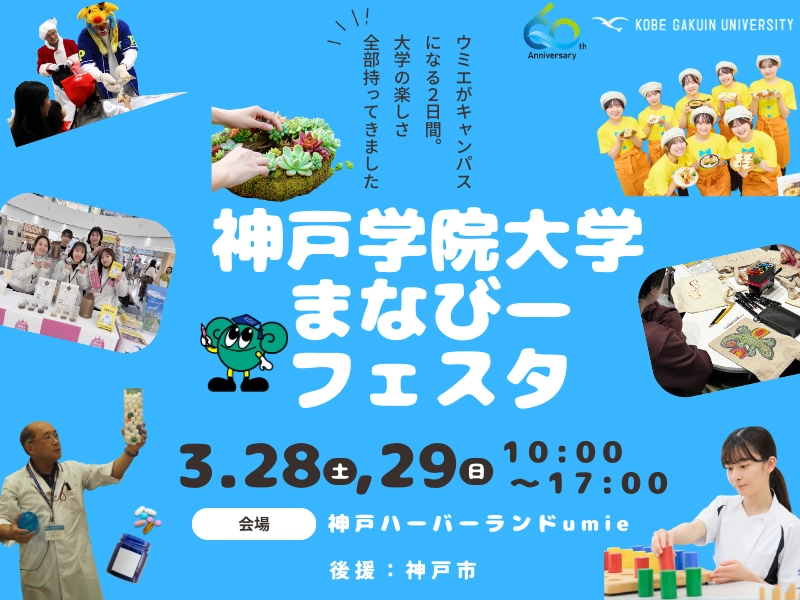 神戸学院大学の10学部が一堂に会し、専門性を生かしたワークショップや体験型講座を実施する「まなびーフェスタ」を3月28日・29日の2日間、神戸ハーバーランドumieにて開催します。