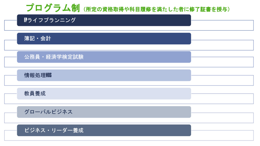 従来のコース制に加え、資格や試験に関する「ファイナンシャルプランナー・ライフプランニング」、「簿記・会計」、「公務員・経済学検定試験」、「情報処理・MOS」、「教員養成」、語学と各国の経済事情を学ぶ「グローバルビジネス」、自営業を継ぐ学生や起業に関心のある学生を対象にした「ビジネスリーダー養成」の7種類のプログラム制を導入。さらに、コースやプログラムの学びを補強し、資格や就職活動、社会人になっても役に立つ「実践力アップ講座」シリーズも新設します。