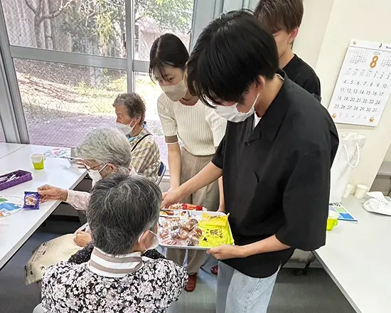 有瀬キャンパスの近くにある高層住宅集会所では、周辺にお住まいの高齢者の方々とおしゃべりを楽しむ「ふれあい喫茶」を実施。独り暮らしの高齢者らが交流できる機会づくりに取り組んでいます。春や夏、クリスマスなど、年に数回はイベントを企画して開催。さらには絵手紙での交流も楽しんでいます。