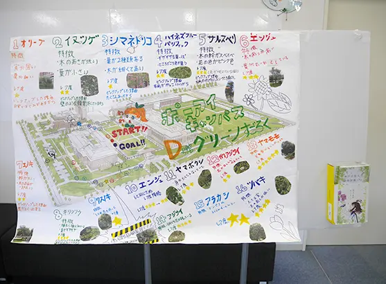 2023年には、現代社会学部・菊川裕幸講師の協力を得て、ポートアイランドキャンパスで植生調査を行い、イラストマップに落とし込んだ植物図鑑を作成。キャンパス内の植物について多くの方に知ってもらいたいと、2025年度には有瀬キャンパス版の作成も進めているところです。