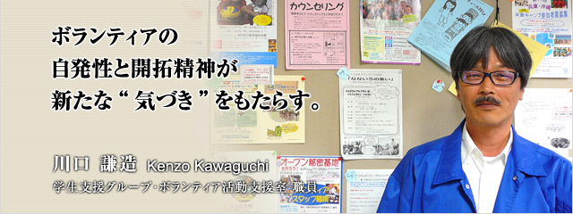大阪の民間団体でボランティアコーディネーターをしていた私が、本学のボランティア活動支援室立ち上げの責任者として着任したのは2005年のことです。ボランティア活動をしたいと希望する学生と、学生を受け入れてくれる団体の間に立ち、ボランティア募集のチラシを学内の掲示板に張ることから始めました。白紙状態からのスタートでしたが、今では多くの学生が支援室を訪れてくれています。