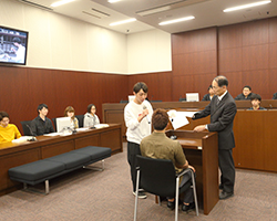 こうして半年ほどの準備期間を経て、本番当日には100人ほどの学生を傍聴席に集め、公開模擬裁判を実施します。一番の特色は、模擬裁判の勝敗を決めるのはゼミ生ではなく、公開模擬裁判で傍聴席に座る学生たちであるという点です。学生に加えて、時にはゼミ生の家族や一般市民も参加し、裁判員裁判の裁判員のような役割を果たします。