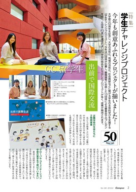 2NO.1832016.9大学創立50周年を記念し、大学の活性化、地域の活性化、社会貢献などに繋がる学生の主体的学びを支援する﹁学生チャレンジプロジェクト﹂。今年は22団体が応募し、書類選考に合格した10団体による審査会でのプレゼンを経て、6団体︵P.3表︶が選ばれました。学部の特色を打ち出したプロジェクトが多く、成果が期待されます。今年も創意あふれるプロジェクトが揃いました!学生チャレンジプロジェクト特集近隣学校の生徒たちに2時間授業 私たちが提案したのは、近隣の中学校︵港島中学校︶へ留学生が出向いて自分の国を紹介する授業をする出前授業のプロジェクトで、1年次生と2年次生、日本語も堪能な11人が参加しています。◀用意周到に練られた計画を提出したGC留学生。 おしゃべりタイムはもちろん日本語。神戸学院大学のグローバル化を進め、地域貢献することを目的とし、あわせて神戸学院大学の好感度を上げることにも役立ちたいと思って、チャレンジプロジェクトに応募しました。 すでに港島中学校の先生方とも打ち合わせ済みで、秋に最初の授業を行う予定です。前半の1時間は私たちが伝統衣装を着て、プロジェクターを使って自国の紹介をします。食事や生活に密着した話題を中心に話します。その後は、希望者に伝統衣装を着て楽しんでもらいます。後半の1時間は、生徒と話し合いをしたいと思います。私たちも聞きたいことが沢山あります。一日をどう過ごしているの?好きな教科は何か?など、私たちの国の中学生とどこが同じで、どこが違うのか話し合って、お互いに理解を深めていきたいと思っています。グローバル・コミュニケーション学部の留学生で続けていきたい 最初の訪問がうまく行ったら、3学期にも出前授業を実施します。今後はさらに対象を広げて近隣の小学校でも実施したいと考えています。この訪問授業がずっと後輩に受け継がれ、出前先も広がって、様々な良い結果を生み出すことを願っています。GC留学生出前で国際交流グローバル・コミュニケーション学部日本語コースグローバル・コミュニケーション学部日本語コース2年次生左からグエンティダンティーさん(ベトナム)元 智恵さん(韓国)龔 潔さん(中国)ウォン チェコン ジェ▼優雅に伝統衣装で。出前授業の イメージイラスト