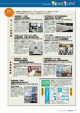 8NO.1832016.9NEWSEVENTEWSVENTニュースイベント図書館では、時事的なものやテーマに応じた様々なイベント・展示を行っています。どんな本を読もうか迷っている方は、一度足を止めてみてください。ポーアイ図書館展示コーナー有瀬図書館図書館では、「学生による学生のための選書」と題して、「学生選書ツアー」を年間4回企画・実施しています。読みたい本があるけど高くて買えない、他の人にもおすすめしたい本があるというあなたは是非ご参加ください!(11月にも開催を予定しています)【後期書籍テーマ展示】『神戸ゆかりの外国人』開催期間:2016年10月1日(土)∼2017年3月31日(金)展示場所:ポーアイ図書館2階催物コーナー「神戸クロニクル」の記者として神戸に滞在したことのある小泉八雲(ラフカディオ・ハーン)をはじめ、神戸ゆかりの外国人達は山、海、街並み、建造物など神戸に多大な影響を与えました。彼らの功績に、新鮮な驚きを感じるかもしれません。是非、本を手に取ってみてください。【2階エントランス前ギャラリー展示】『日本再発見小泉八雲の見た日本』開催期間:2016年8月25日(木)∼2016年10月31日(月)展示場所:ポーアイ図書館入口ゲート横ギャラリー今回のポーアイ図書館ギャラリー展では、「日本再発見 小泉八雲の見た日本」と題し、小泉八雲が神戸クロニクル社で執筆した「神戸クロニクル論説」をはじめ、神戸にゆかりのある人物を通して新しい視点から日本を感じられる図書を展示しています。これらの資料は図書館にて貴重書として保管されています。普段はなかなか目にすることのできない資料ですので、この機会に小泉八雲をはじめとする新たな視点での日本の良さをお楽しみください。【神戸学院大学-神戸海洋博物館展示】『世界の帆船∼海と戦争∼』開催期間:2016年11月7日(月)∼2017年2月28日(火)展示場所:ポーアイ図書館入口ゲート横ギャラリー【スポット展示】『インターシップ並びにボランティア・ インターシップによる書籍展示』開催期間:2016年9月8日(木)∼2016年10月31日(月)展示場所:ポーアイ図書館2階催物コーナーインターンシップとボランティア・インターンシップが展示の実習を行いました。学生達がテーマを考え、本を選び、ポップや看板作成等を行い、工夫を凝らした展示をしています。あなたにぴったりな1冊が見つかるかもしれません。是非、ご覧ください。【後期書籍テーマ展示】『夏目漱石没後百年 「天に則り私を去る」』開催期間:2016年10月1日(土)∼2017年3月31日(金)展示場所:有瀬図書館 新館2階催物コーナー2016年は夏目漱石没後100年です。『坊っちゃん』『吾輩は猫である』『こころ』など、皆さんにもなじみのある漱石の作品を多数ご紹介します。100年以上たっても読み継がれる漱石の世界をご堪能ください。【有瀬図書館ギャラリー展示】『神戸学院大学五十周年のあゆみ』開催期間:2016年8月1日(日)∼2016年11月10日(木)展示場所:有瀬図書館本館2階エントランスコーナーギャラリー展では、神戸学院大学が開学50周年を迎えるにあたって、図書館の歴史を振り返ります。図書館オープン時の貴重な写真を展示していますので、ぜひご覧ください。また、創刊当時の『CAMPUS』などの資料も展示しますので、お楽しみください。【有瀬図書館ミニ展示】『夜空の星をながめよう』開催期間:2016年9月1日(木)∼2016年10月31日(月)展示場所:有瀬図書館 本館2階メインカウンター横徐々に日も短くなり、秋の気配を感じる季節になってきました。今回図書館では「夜空の星」をテーマに、星座や宇宙などの自然科学の分野から神話や星を題材にした小説など、いろんな資料を集めてみました。世界の帆船に関する図版、切り絵、図書、模型を展示しております。今回は、チリ海軍の練習艦で、「浮かぶ大使館」として名高い「エスメラルダ号」の模型にご注目ください。皆様のお越しをお待ちしております。WEBで選ぶ書店で選ぶ学生選書参加者を募集しています