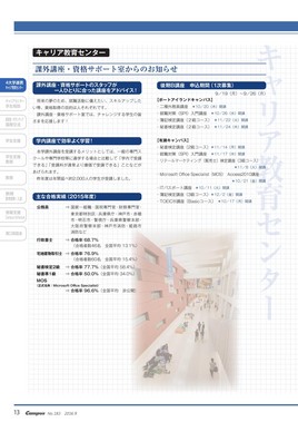 課外講座・資格サポートのスタッフが一人ひとりに合った講座をアドバイス!学内講座で効率よく学習!主な合格実績(2015年度)将来の夢のため、就職活動に備えたい、スキルアップしたい等、資格取得の目的は人それぞれです。課外講座・資格サポート室では、チャレンジする学生の皆さまを応援します!本学課外講座を受講するメリットとしては、一般の専門スクールや専門学校等に通学する場合と比較して「学内で受講できる」「受講料が通常より廉価で受講できる」ことなどがあげられます。昨年度は年間延べ約2,000人の学生が受講しました。公務員⇒国家一般職・国税専門官・財務専門官・東京都特別区・兵庫県庁・神戸市・赤穂市・明石市・警視庁・兵庫県警察本部・大阪府警察本部・神戸市消防・姫路市消防など行政書士⇒合格率68.7%(合格者数46名全国平均13.1%)宅地建物取引士⇒合格率76.9%(合格者数60名全国平均15.4%)秘書検定2級⇒合格率77.7%(全国平均58.4%)秘書準1級⇒合格率50.0%(全国平均34.0%)MOS(正式名称:MICROSOFTOFFICESPECIALIST)⇒合格率96.6%(全国平均非公開)後期B講座申込期間(1次募集)【ポートアイランドキャンパス】・二種外務員講座*10/20(木)開講・就職対策(SPI)入門講座*10/26(水)開講・簿記検定講座(2級コース)*11/22(火)開講・秘書検定講座(2級コース)*11/24(木)開講【有瀬キャンパス】・秘書検定講座(2級コース)*11/14(月)開講・就職対策(SPI)入門講座*11/17(木)開講・リテールマーケティング(販売士)検定講座(3級コース)*11/8(火)開講・MICROSOFTOFFICESPECIALIST(MOS)ACCESS2010講座*10/21(金)開講・ITパスポート講座*10/11(火)開講・簿記検定講座(3級コース)*12/2(金)開講・TOEIC®講座(BASICコース)*10/17(月)開講9/19(月)~9/26(月)キャリア教育センター課外講座・資格サポート室からのお知らせキャリア教育センターキャリアセンター学生相談学生支援学生支援教務教務教務教育開発・入試情報支援CAMPUSSCHEDULE医務室・ボランティア国際交流4大学連携キャリア教育センター溝口奨励金13NO.1832016.9