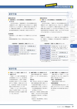 INFORMATION大学からのお知らせ7【履修必修科目】■「基礎演習Ⅱ」(2年次前期配当)の受講者募集について●1年次生1年次生を対象に、「基礎演習Ⅱ」(2年次前期配当科目)の募集を行います。受講するためには申込のうえ、履修許可を得ておくことが必要です。募集の日程は下記の通りです。募集に関する詳細については10月にKPC事務センター前の経営学部掲示板(A号館1階)に掲示する予定です。【注意事項】・「基礎演習Ⅰ」と同一教員のクラスで履修することはできません。・学際教育機構所属(予定)の学生は申込はできません。【履修必修科目】■「演習ⅠA」(3年次前期配当)の受講者募集について●2年次生2年次生を対象に、「演習ⅠA」(3年次前期配当科目)の募集を行います。受講するためには、申込のうえ、履修許可を得ておくことが必要です。募集の日程は以下の通りです。募集に関する詳細については10月にKPC事務センター前の経営学部掲示板(A号館1階)に掲示、および10月下旬に配付する「紹介冊子」にてお知らせする予定です。【注意事項】・「演習ⅠA」を修得しないと「演習ⅠB」(3年次後期配当科目)「演習Ⅱ」・「卒業論文」(4年次配当科目)を履修することはできません。■「学習シート」の配付・返却について1、目的について「学習シート」に基づく教育指導(自己学習管理システム)は、自ら具体的な学習目標を設定し、目標への挑戦と自己評価・反省というプロセスを繰り返すことで着実に、卒業に向かうと共に、生涯を通じて必要とされる自己教育能力の育成を目的としています。「学習シート」は1~3年次生全員を対象とする表面「学習シートA」と成績不振者のみを対象とする裏面「学習シートB」があります。2、後期「学習シート」の配付について後期の履修登録に際し、後期用の「学習シート」を1~3年次生に配付します。【配付日】●1・2年次生:9月12日(月)履修指導時(履修指導の時間・場所については掲示板等で確認してください。)※履修指導に欠席した場合は、KAC教務事務室窓口で受け取り、必ず提出してください。●3年次生:「演習Ⅲ」履修者は演習時間に、それ以外の方はKAC教務事務室窓口で受け取り、必ず提出してください。※提出先・提出期間等は、掲示にてお知らせします。3、前期「学習シート」の返却について前期に提出した「学習シート」をまだ受け取っていない方は、至急以下の場所にて受け取ってください。【演習Ⅰ・演習Ⅲ履修者】演習担当教員より返却します。【演習未履修者】経済学部教務委員(西山先生)より返却しますのでオフィスアワーの時間帯に研究室(KAC8号館7階)を訪ねてください。<経営学部>「基礎演習Ⅱ」募集スケジュール申込・発表第1次募集期間10月28日(金)~11月16日(水)※所属発表12月9日(金)第2次募集期間12月9日(金)~12月15日(木)※所属発表2017年1月16日(月)※いずれの受付最終日も、受付時間が通常と変わり、15時30分までですのでご注意ください。<経営学部>「演習ⅠA」募集スケジュール申込・発表説明会(冊子配布)日時10月28日(金)12:55~13:25※10月28日(金)に欠席された場合、必ず11月11日(金)に参加してください。場所B302教室第1次募集期間10月28日(金)~11月16日(水)※所属発表12月9日(金)第2次募集期間12月9日(金)~12月15日(木)※所属発表2017年1月16日(月)※いずれの受付最終日も、受付時間が通常と変わり、15時30分までですのでご注意ください。経営学部経済学部教務キャリアセンター学生相談学生支援学生支援教務教務教務教育開発・入試情報支援CAMPUSSCHEDULE医務室・ボランティア国際交流4大学連携キャリア教育センター溝口奨励金24NO.1832016.9