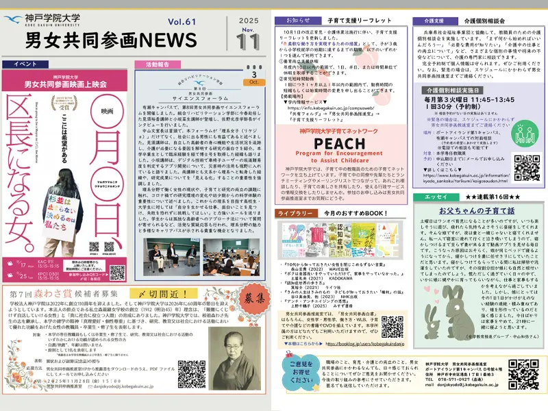 学内外における男女共同参画推進に関する取組等を取り上げ、情報を発信するため、神戸学院大学男女共同参画ニュースを定期的に配信します。