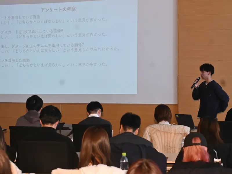 優秀賞の3人のうち青木さんの発表は男性が街中でスカートをはいているのを見た時にどのように感じるかなどの質問を用意して本学学生にアンケート調査し、スカート男子に対する肯定的または中立的な意見が約7割を占めることなどを紹介しました。