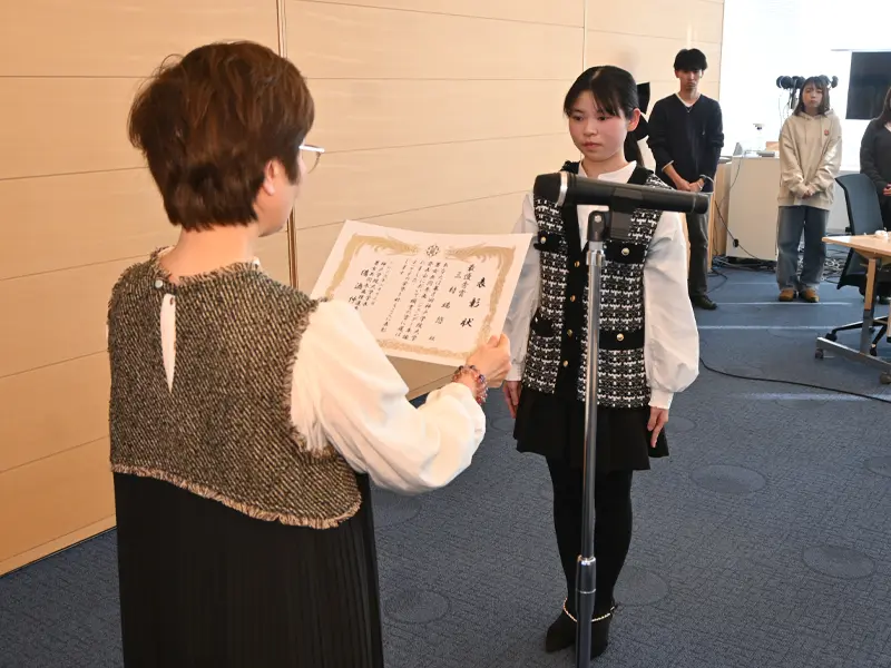最後に中山文・男女共同参画推進室長(人文学部教授)が受賞した学生4人に表彰状と副賞の図書カードを贈ってたたえ、「ジェンダーの面から考えると新しい視点が生まれますが、それだけでは研究としては不十分で、作成にかけた時間に比例して良い論文になることが分かります」と講評しました。それぞれの発表については、「最優秀の三村さんのスーパー戦隊を題材にした研究は、先日学内で開かれた男女共同参画推進委員会の中の女性リーダーがなかなか目標数に達しないという課題と共通していました。青木さんの研究は、男性がスカートを履いて自己主張するには現在でも覚悟が必要なこと、またその覚悟は周囲に理解され受容されてきた経験から生まれていることを教えてくれました。針崎さんの発表は、大学で学んだジェンダー学の視点から同一作品における25年間の変化を一つのセリフで浮かび上がらせました。まさに本学のジェンダー教育の成果が生きていると感じたうれしい卒業論文でした。藤吉さんの成果を拝見し、他人のタトゥーには寛容でも自分の母親には容認できないという結果に、母と子の特別な関係性を感じました。将来自分も母親になるかもしれないと考えると、簡単に決断できないことですね」と感想を述べました。