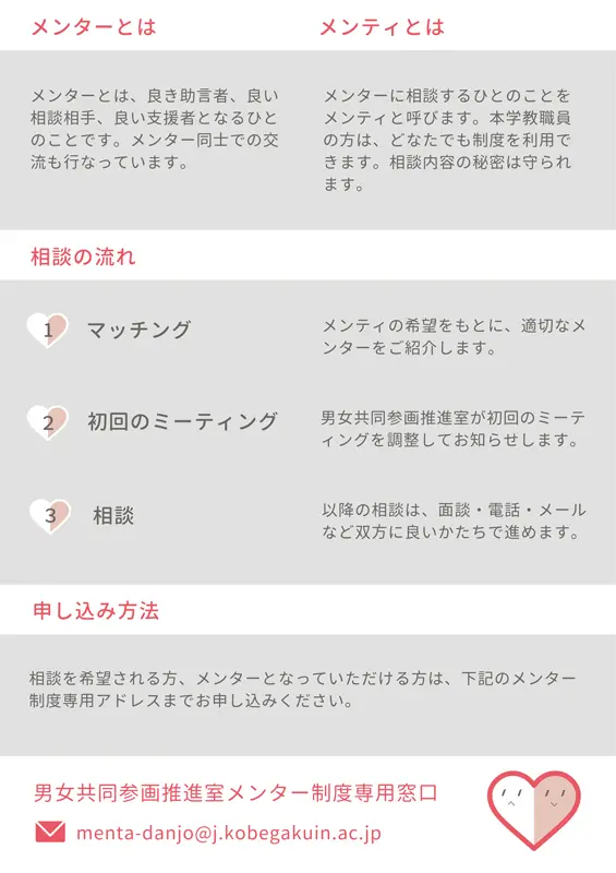 ライフイベント(子育てや介護など)やキャリア形成について、経験豊かな先輩から具体的な助言や情報を得られるかもしれません。相談内容の秘密は守られます。本学教職員で、相談を希望される方、メンターとなっていただける方は、下記の専用アドレスまでお気軽にお問い合わせください。