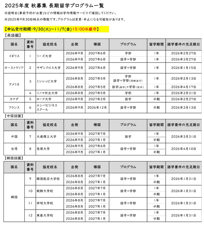 - 留学時期や修得単位、卒業計画等を指導教員および教務センターの所属学部担当者へ相談する