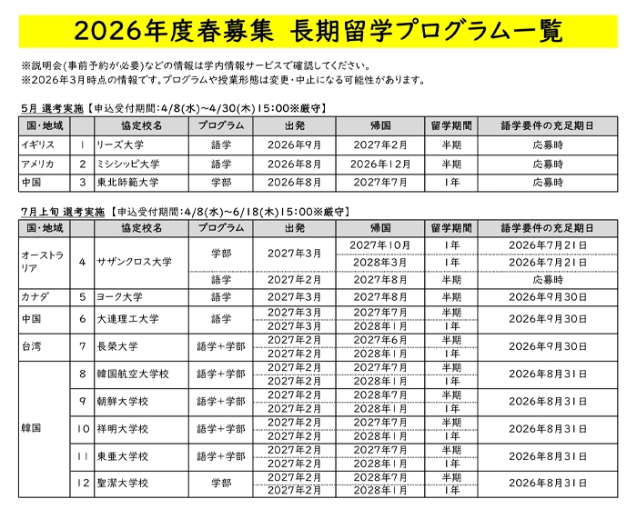 中国語圏・韓国語圏・英語圏への長期留学を希望する学生を対象に、説明会を開催します。いずれもZoomで実施します。参加を希望する方は、各申込フォームからお申し込みください。