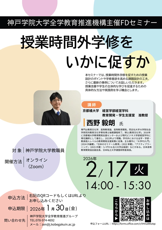 - 概要:本セミナーでは、授業時間外学修を促すための授業設計のポイントや学修意欲を高める課題設計の工夫、さらに最新の事例についてお話しいただきます。授業改善や学生の主体的な学びを促進するための具体的な方法や実践例を学ぶ機会とします。
