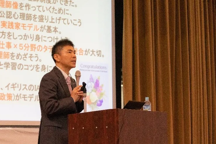 続いて石﨑淳一心理学研究科長が公認心理師育成について、「現場での問題は複雑化しており、かなり高度な知識と技能を持った人材の養成を期待されている。この期待に応え、社会貢献するために尽力したい。」と挨拶を述べました。