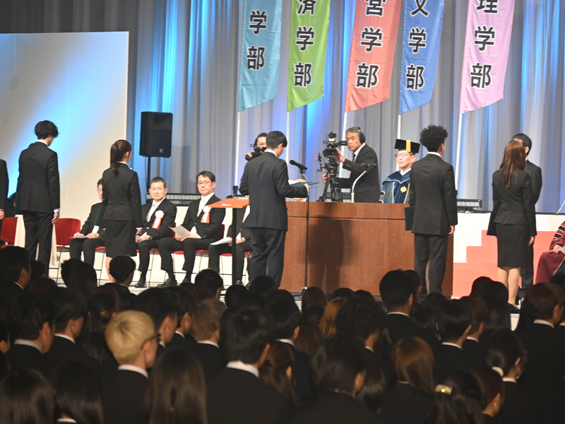 今年度は学部新入生2577人、編・転入生6人、大学院の新入生40人が私たちの仲間に加わりました。新入生代表の署名宣誓は、法学部の前田修吾さんが指名され、壇上で宣誓文を読み上げ、署名しました。続いて各学部の新入生代表が学部長に宣誓書を提出しました。大学院新入生代表は心理学研究科の清水雛さんが指名され、壇上で宣誓し、備酒伸彦学長に宣誓書を提出しました。
