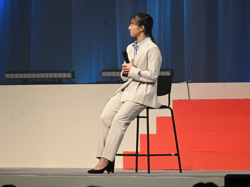 入学式終了後は歓迎式がありました。まず、同窓会が企画した「坂本花織から新入生へのメッセージ 神戸から世界へ」を実施しました。特別ゲストの卒業生として、ミラノ・コルティナ冬季五輪女子シングル銀メダリストで、チェコ・プラハ世界選手権女子シングルに日本勢初の4回目優勝を成し遂げたフィギュアスケーターの坂本花織さんがフリーアナウンサーの上原伊代さんとトークライブを展開し、会場の雰囲気は最高潮に達しました。坂本さんは、今シーズンで現役を引退し、指導者になるこれからの人生において経営学部での学びが生かされると話してくれました。また、キャンパスは友情を育む場でもあったとして、作ってきた弁当を交換をしたり、大声でおしゃべりを楽しんだりした学生時代の友人との付き合いは今も続いていることも紹介してくれました。最後に坂本さんの掛け声で、新入生が「未来へジャンプ」と大きな声で叫びました。