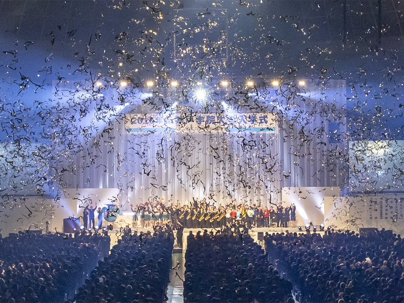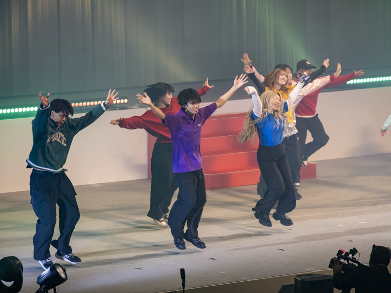 続いて、課外活動団体に所属する在学生が混声合唱(パンドラ)、ダンス(Bust A Move)、チアリーディング、吹奏楽演奏を舞台上で繰り広げました。フィナーレは会場全体にとどろく号砲を合図に金銀のテープがシャワーのように降り注ぎました。